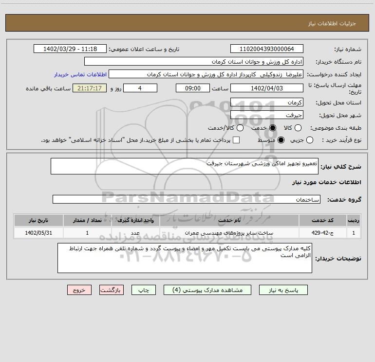 شرح کلی نیاز: تعمیرو تجهیز اماکن ورزشی شهرستان جیرفت