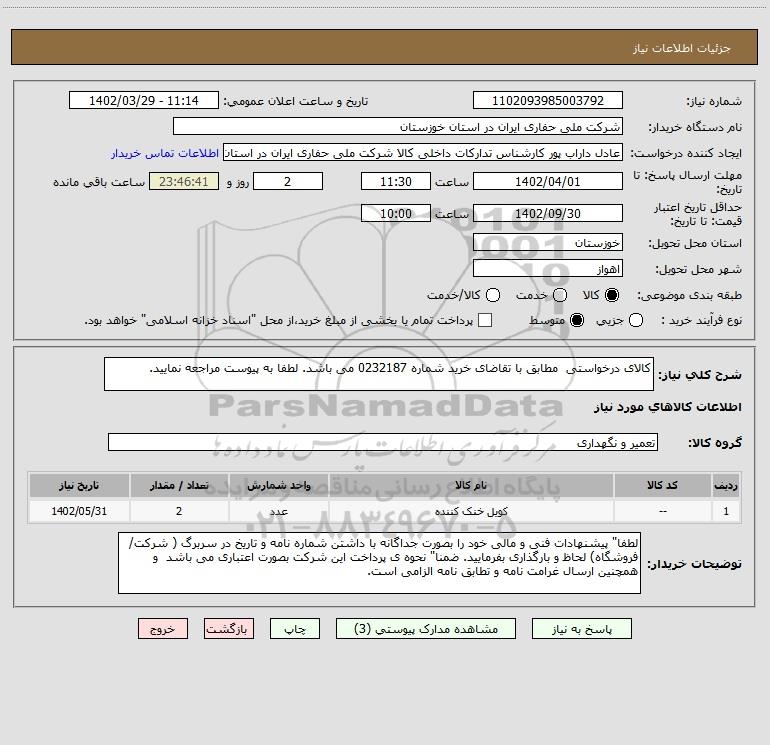 شرح کلی نیاز: کالای درخواستی مطابق با تقاضای خرید شماره 0232187 می باشد. لطفا به پیوست مراجعه نمایید.