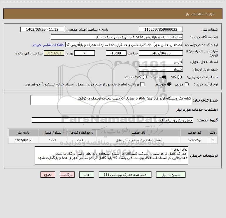 شرح کلی نیاز: کرایه یک دستگاه لودر کاتر پیلار 966 یا معادل آن جهت مجتمع تولیدی دوکوهک