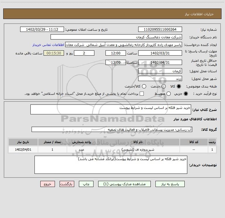 شرح کلی نیاز: خرید شیر فلکه بر اساس لیست و شرایط پیوست