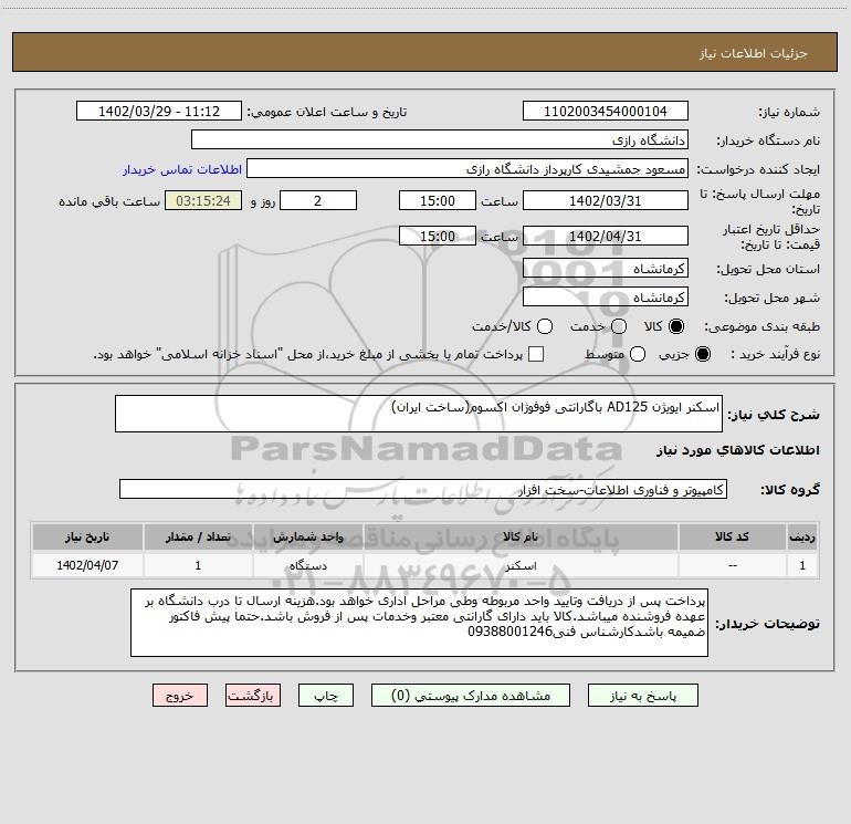 شرح کلی نیاز: اسکنر ایویژن AD125 باگارانتی فوفوژان اکسوم(ساخت ایران)
