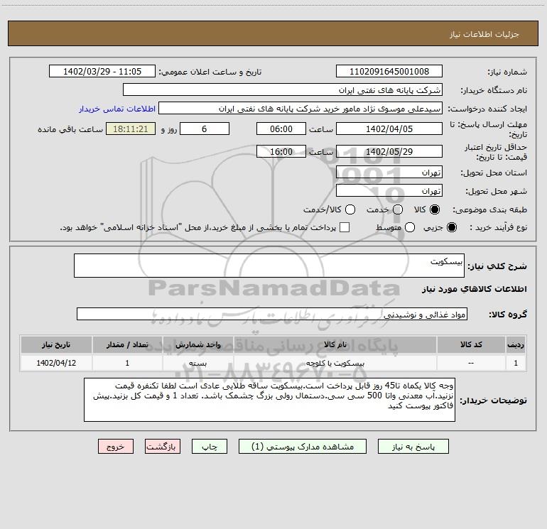 | 1 | -- | بیسکویت یا کلوچه | بسته | 1 | 1402/04/12 |
