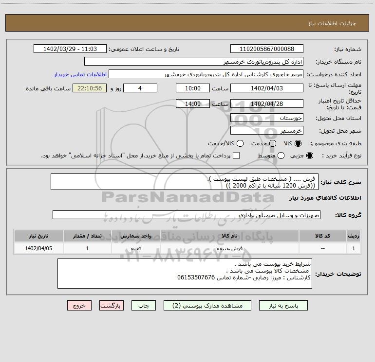 شرح کلی نیاز: فرش .... ( مشخصات طبق لیست پیوست ). ((فرش 1200 شانه با تراکم 2000 ))