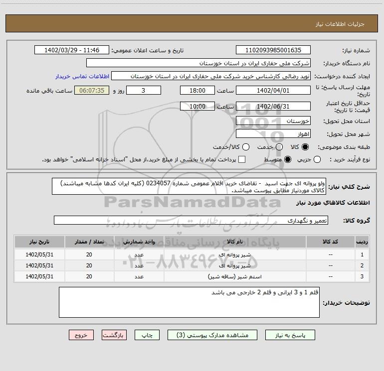 شرح کلی نیاز: ولو پروانه ای جهت اسید - تقاضای خرید اقلام عمومی شماره 0234057 (کلیه ایران کدها مشابه میباشند) کالای موردنیاز مطابق پیوست میباشد.