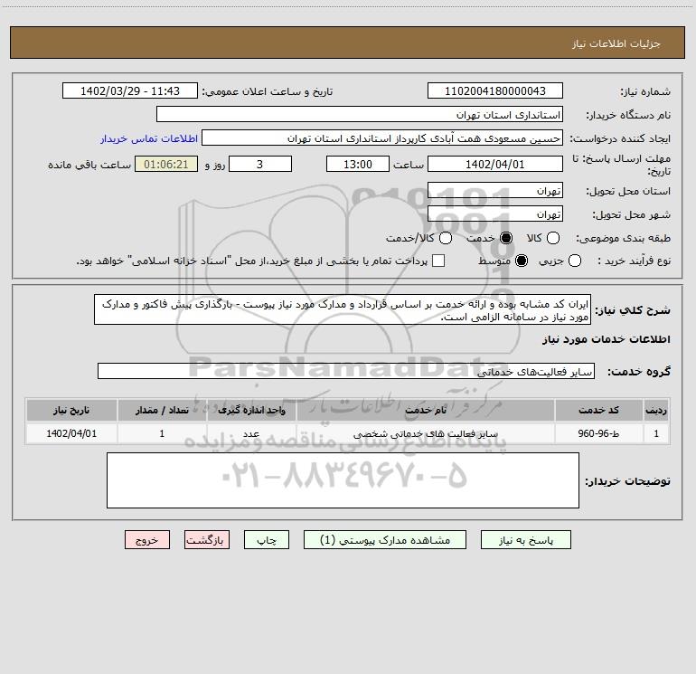 شرح کلی نیاز: ایران کد مشابه بوده و ارائه خدمت بر اساس قرارداد و مدارک مورد نیاز پیوست - بارگذاری پیش فاکتور و مدارک مورد نیاز در سامانه الزامی است.