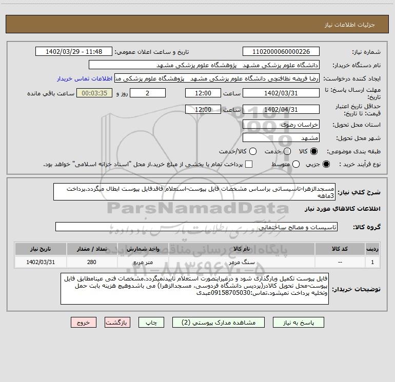 استعلام مسجدالزهرا-تاسیساتی براساس مشخصات فایل پیوست-استعلام فاقدفایل پیوست ابطال میگردد.پرداخت 3ماهه, استعلام مسجدالزهرا-تاسیساتی براساس مشخصات فایل پیوست-استعلام فاقدفایل پیوست ابطال میگردد.پرداخت 3ماهه