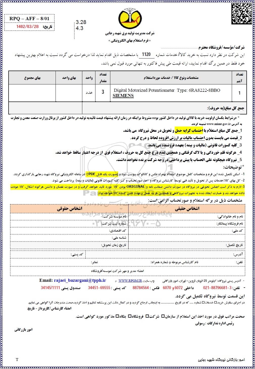 1- اسکن تکمیل شده این فرم و مشخصات کامل موضوع استعلام به همراه عکس و کاتالوگ پیوست شده به صورت یک فایل PDF در سامانه الکترونیکی نیروگاه شهید رجایی بارگذاری گردد