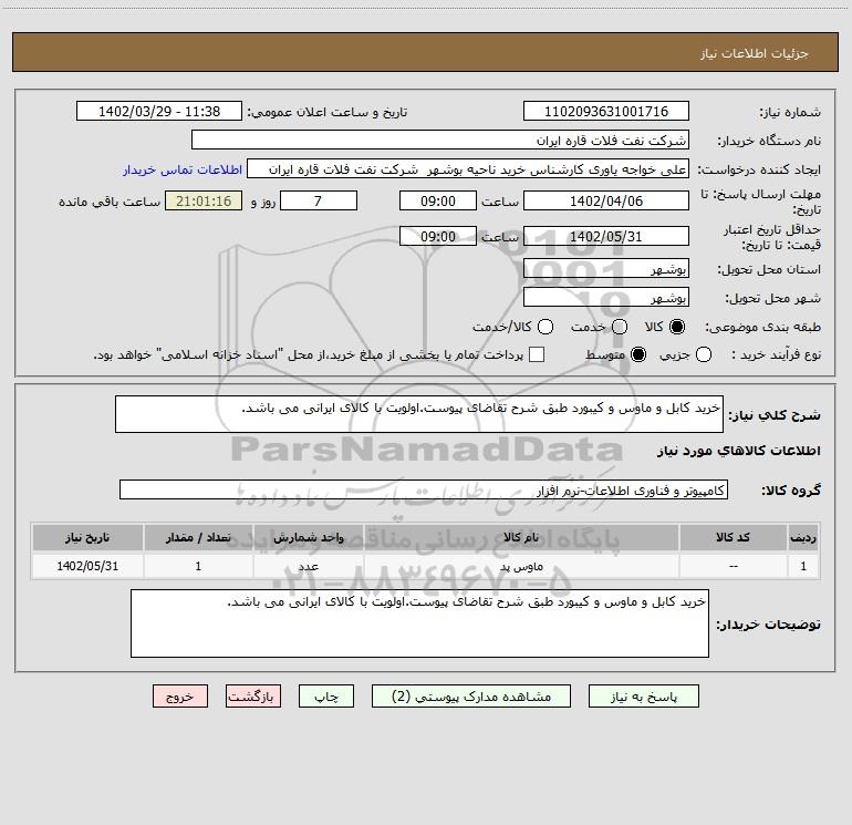 شرح کلی نیاز: خرید کابل و ماوس و کیبورد طبق شرح تقاضای پیوست.اولویت با کالای ایرانی می باشد.