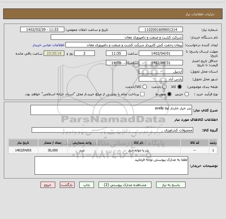 | 1 | -- | بذر یا جوانه خیار | عدد | 30,000 | 1402/04/05 |