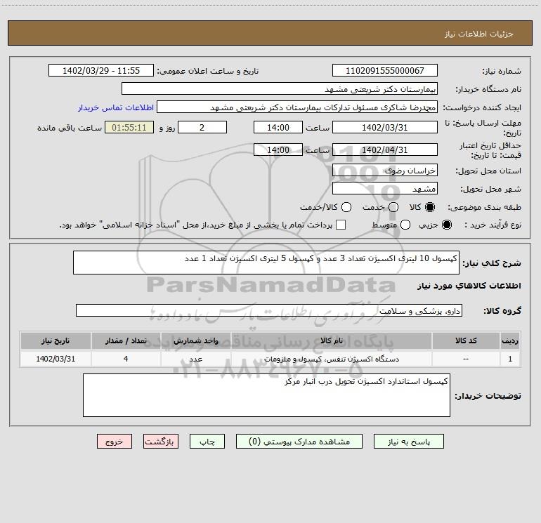 شرح کلی نیاز: کپسول 10 لیتری اکسیژن تعداد 3 عدد و کپسول 5 لیتری اکسیژن تعداد 1 عدد