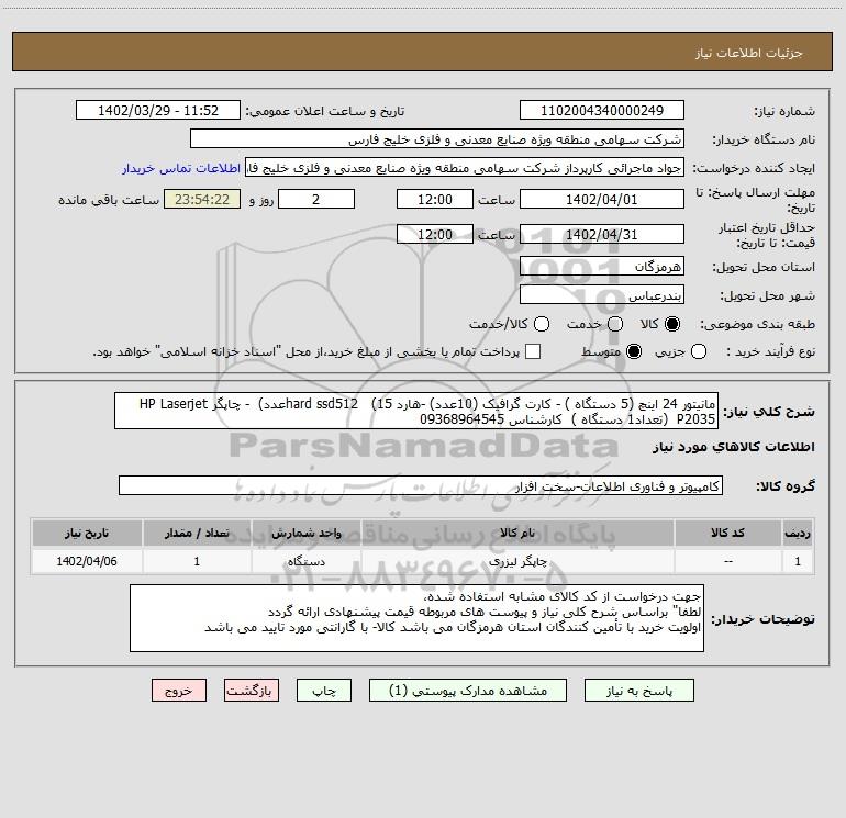 شرح کلی نیاز: مانیتور 24 اینچ (5 دستگاه ) - کارت گرافیک (10عدد) -هارد hard ssd512 (15عدد) - چاپگر HP Laserjet P2035 (تعداد1 دستگاه ) کارشناس 09368964545