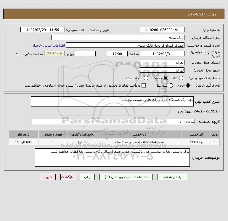 شرح کلی نیاز: تهیه یک دستگاه دیزل ژنراتور/طبق لیست پیوست