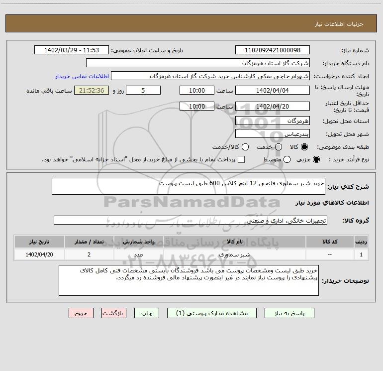 شرح کلی نیاز: خرید شیر سماوری فلنجی 12 اینچ کلاس 600 طبق لیست پیوست