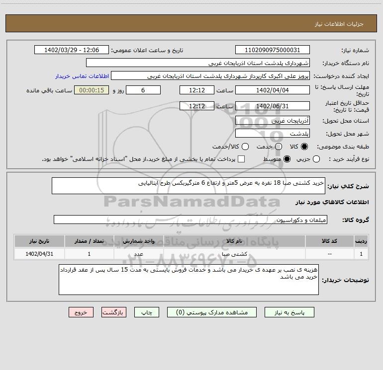 شرح کلی نیاز: خرید کشتی صبا 18 نفره به عرض 5متر و ارتفاع 6 مترگیربکس طرح ایتالیایی