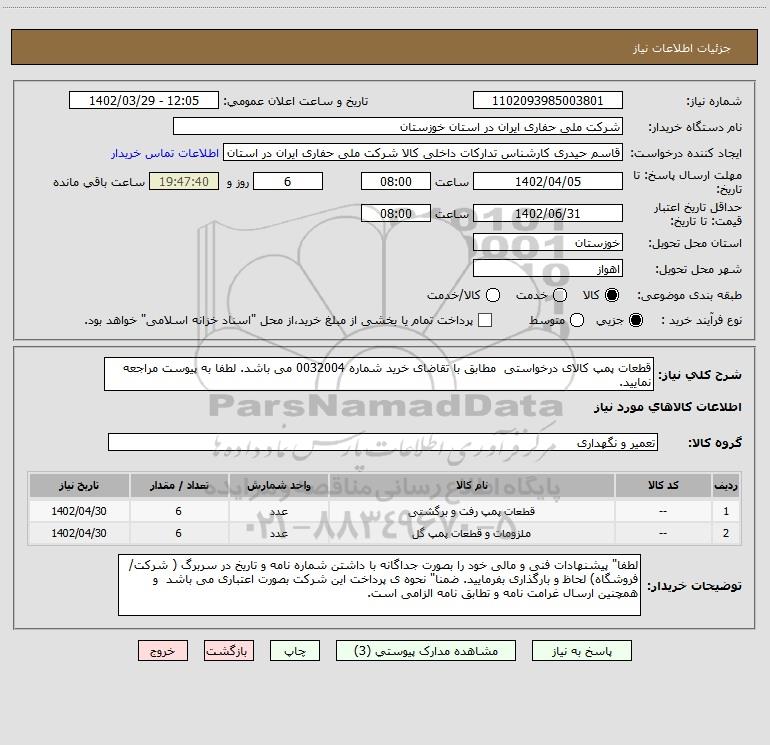شرح کلی نیاز: قطعات پمپ کالای درخواستی مطابق با تقاضای خرید شماره 0032004 می باشد. لطفا به پیوست مراجعه نمایید.