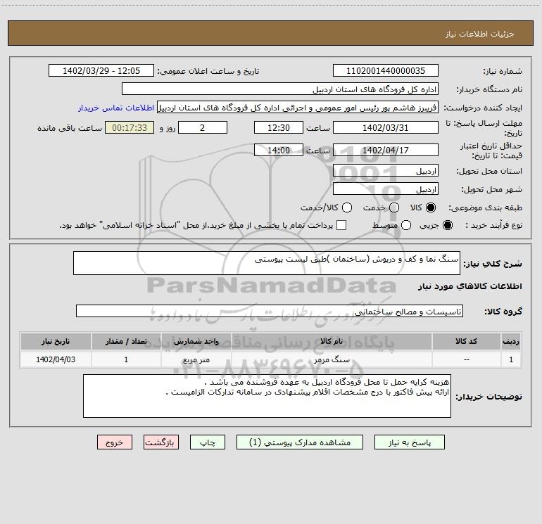 شرح کلی نیاز: سنگ نما و کف و درپوش (ساختمان )طبق لیست پیوستی