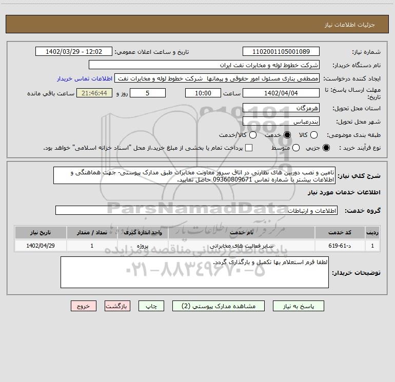شرح کلی نیاز: تامین و نصب دوربین های نظارتی در اتاق سرور معاونت مخابرات طبق مدارک پیوستی- جهت هماهنگی و اطلاعات بیشتر با شماره تماس 09360809671 حاصل نمایید.