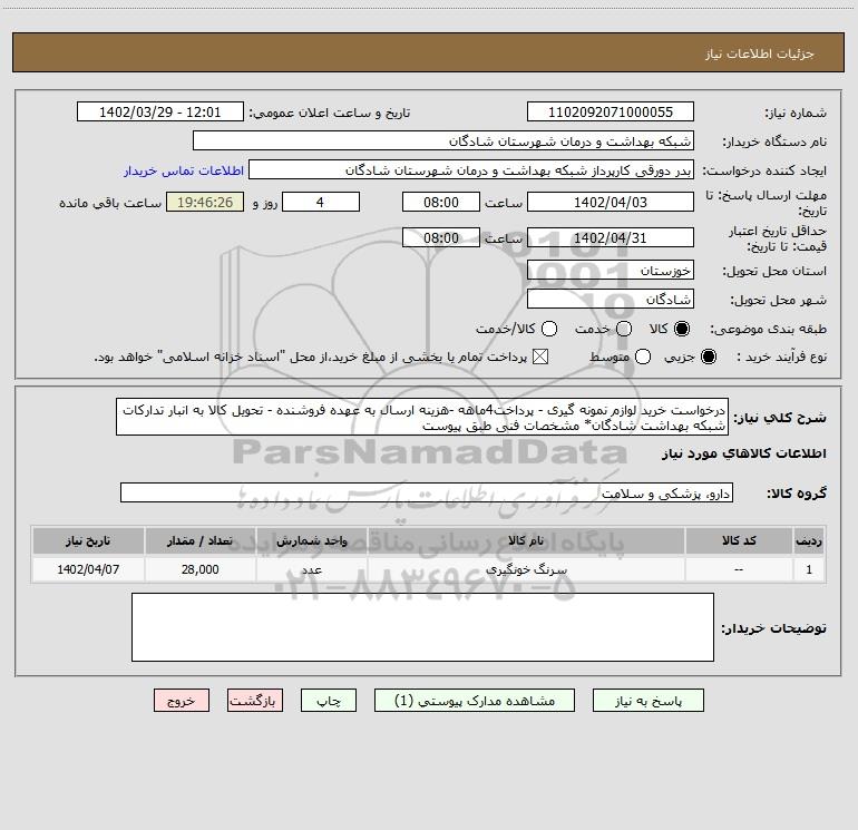 شرح کلی نیاز: درخواست خرید لوازم نمونه گیری - پرداخت4ماهه -هزینه ارسال به عهده فروشنده - تحویل کالا به انبار تدارکات شبکه بهداشت شادگان* مشخصات فنی طبق پیوست