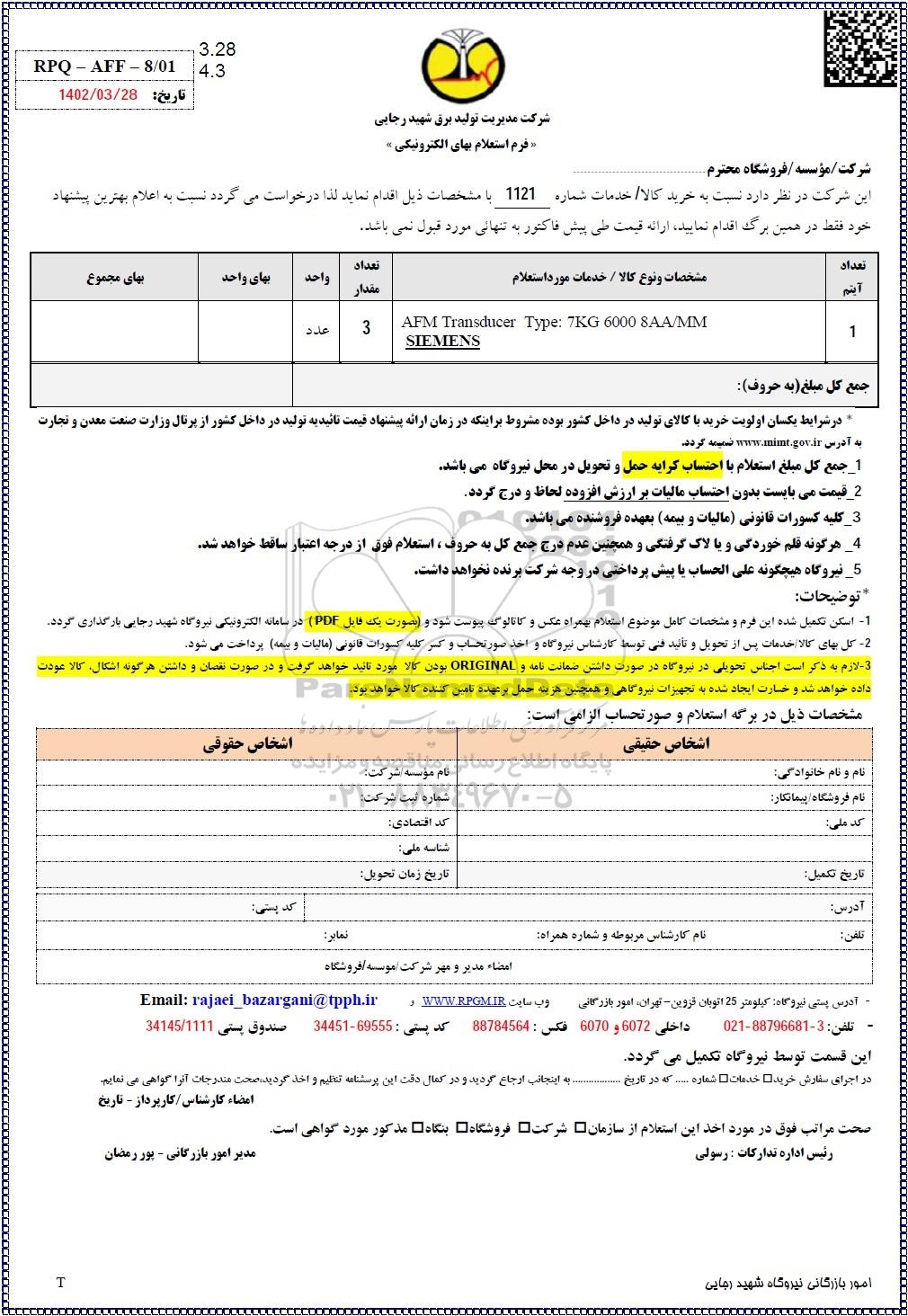 این شرکت در نظر دارد نسبت به خرید کالا/ خدمات شماره 1121 با مشخصات ذیل اقدام نماید. لذا درخواست می گردد نسبت به اعلام بهترین پیشنهاد خود فقط در همین برگ اقدام نمایید، ارائه قیمت طی پیش فاکتور به تنهائی مورد قبول نمی باشد.