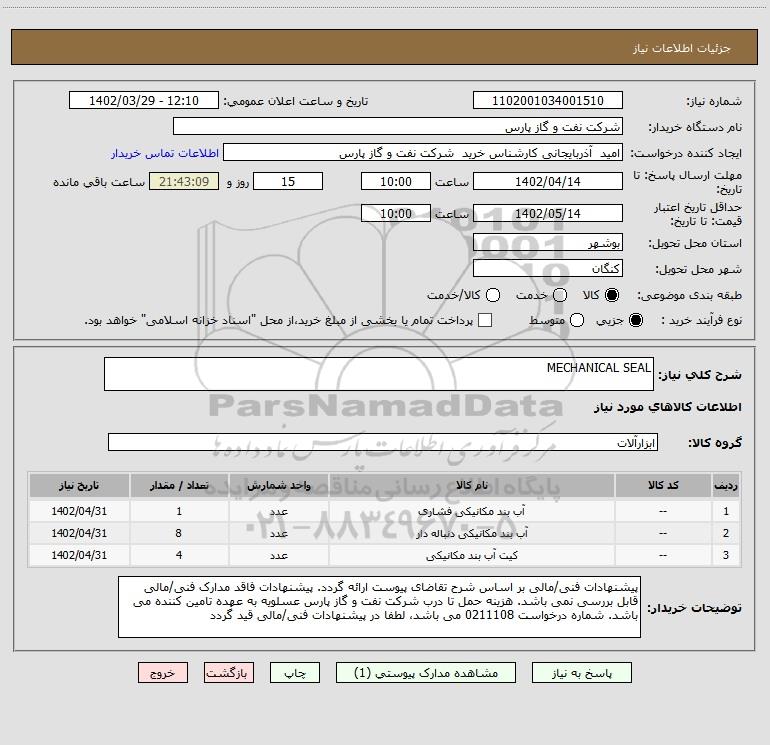 | 1 | -- | آب بند مکانیکی فشاری | عدد | 1 | 1402/04/31 |