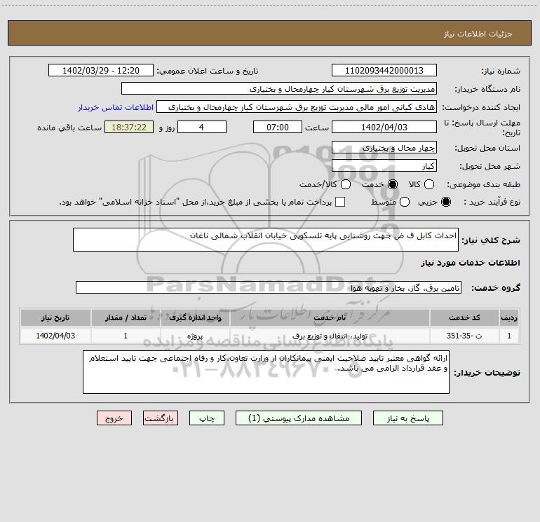 شرح کلی نیاز: احداث کابل ف ض جهت روشنایی پایه تلسکوپی خیابان انقلاب شمالی ناغان