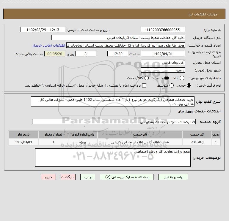 شرح کلی نیاز: خرید خدمات عمومی (بکارگیری دو نفر نیرو ) در 4 ماه شمسی سال 1402 طبق مصوبه شورای عالی کار