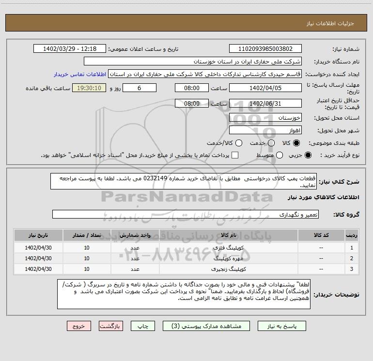 شرح کلی نیاز: قطعات پمپ کالای درخواستی مطابق با تقاضای خرید شماره 0232149 می باشد. لطفا به پیوست مراجعه نمایید.