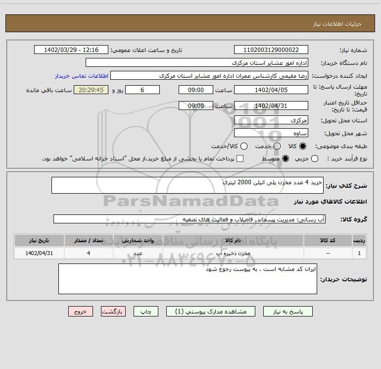 شرح کلی نیاز: خرید 4 عدد مخزن پلی اتیلن 2000 لیتری
