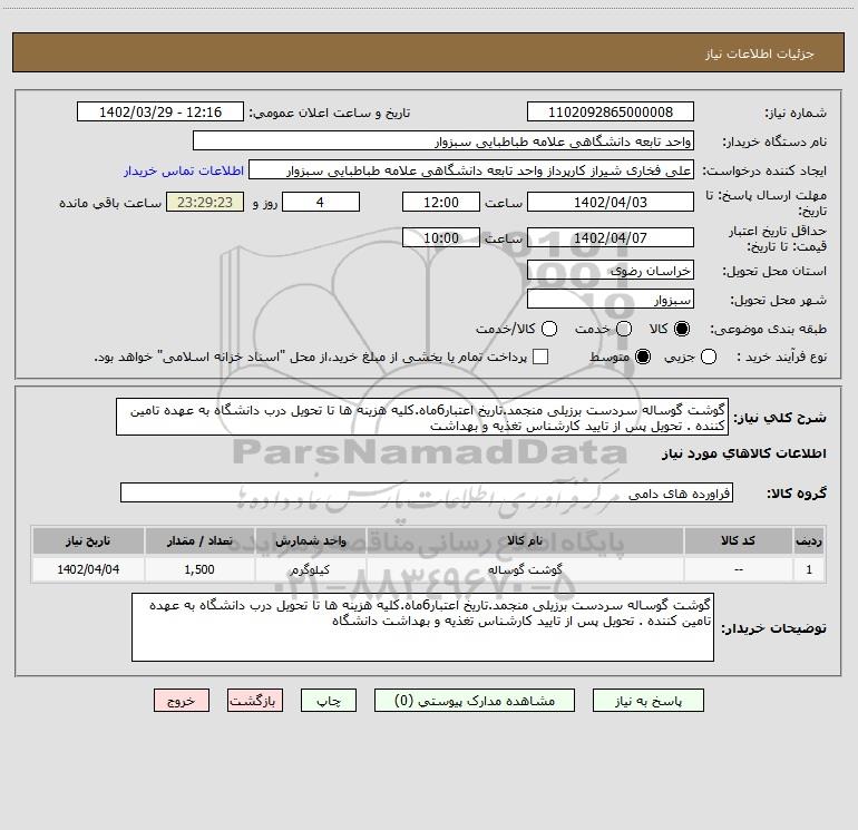 شرح کلی نیاز: گوشت گوساله سردست برزیلی منجمد.تاریخ اعتبار6ماه.کلیه هزینه ها تا تحویل درب دانشگاه به عهده تامین کننده . تحویل پس از تایید کارشناس تغذیه و بهداشت