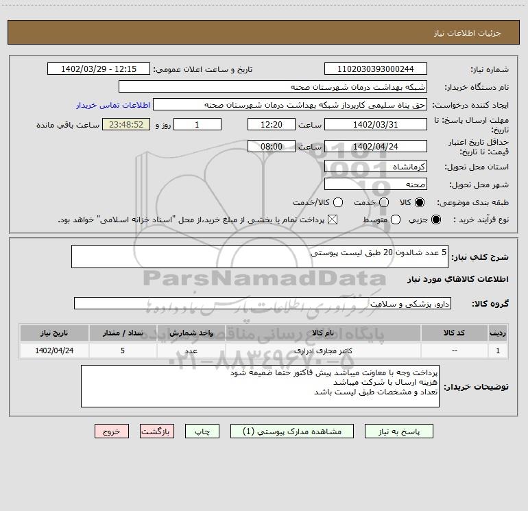 شرح کلی نیاز: 5 عدد شالدون 20 طبق لیست پیوستی