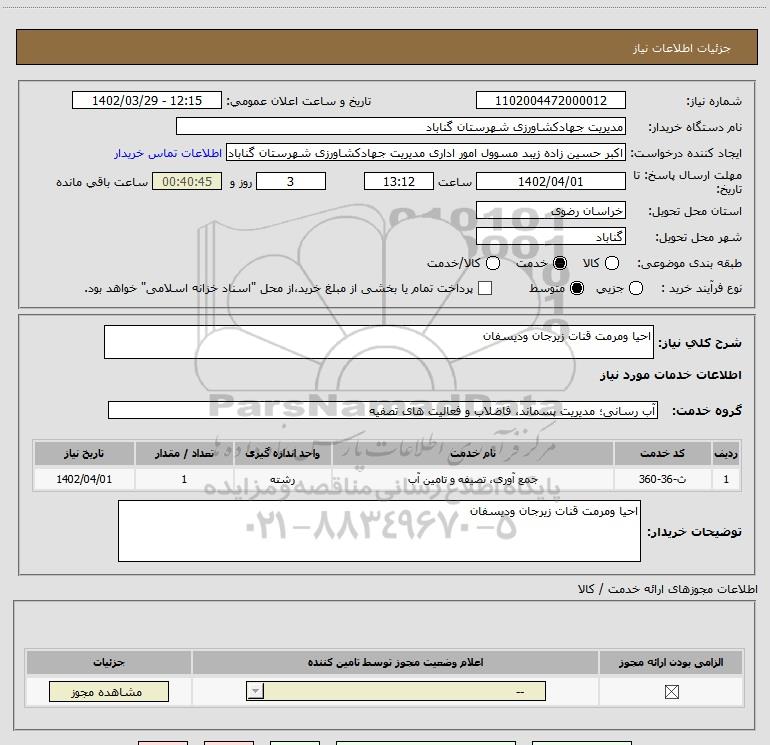 نام دستگاه خریدار:مدیریت جهادکشاورزی شهرستان گناباد