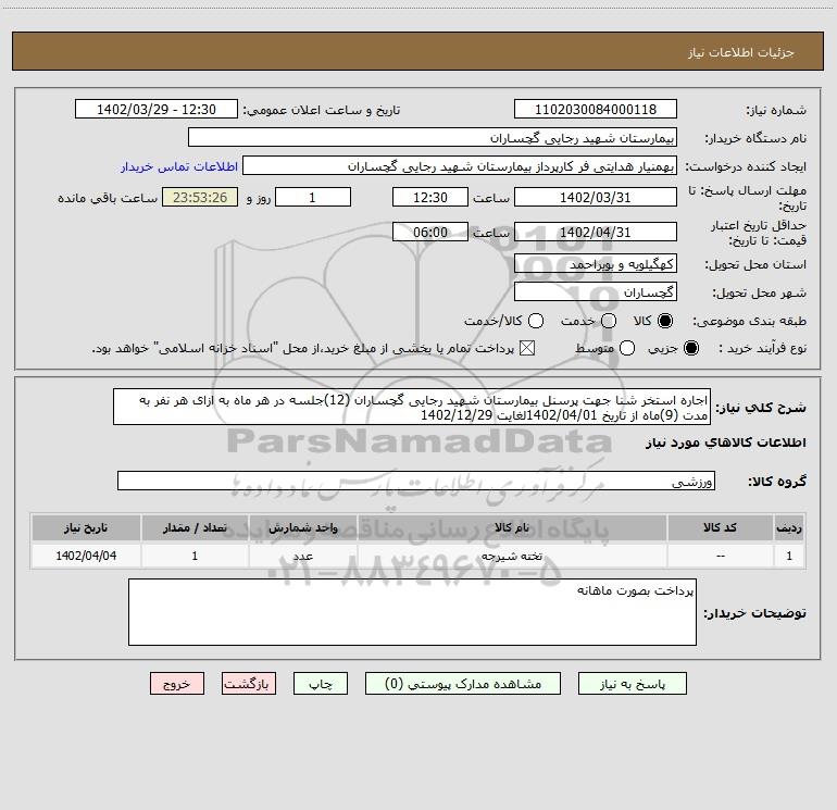 شرح کلی نیاز: اجاره استخر شنا جهت پرسنل بیمارستان شهید رجایی گچساران (12)جلسه در هر ماه به ازای هر نفر به مدت (9)ماه از تاریخ 1402/04/01لغایت 1402/12/29