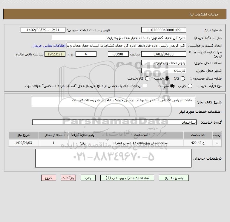 شرح کلی نیاز: عملیات اجرایی تکمیلی استخر ذخیره آب اراضی خونیک باباحیدر شهرستان فارسان