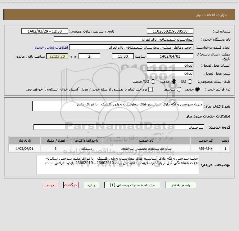 شرح کلی نیاز: جهت سرویس و نگه داری آسانسور های بیمارستان و پلی کلینیک با نیروی مقیم