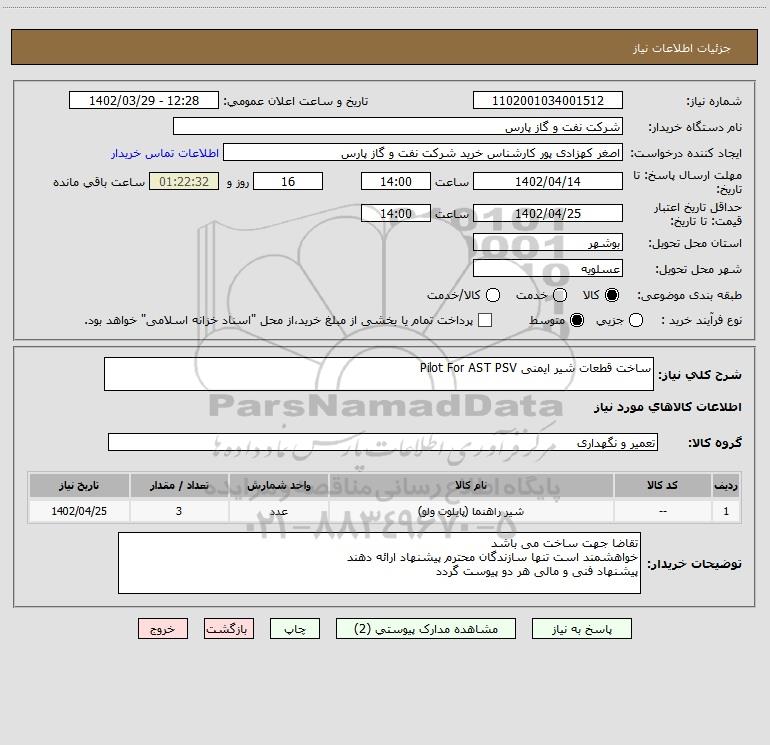 شرح کلی نیاز: ساخت قطعات شیر ایمنی Pilot For AST PSV