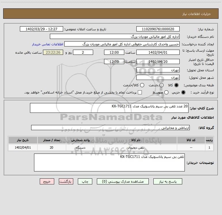 شرح کلی نیاز: 20 عدد تلفن بی سیم پاناسونیک مدل KX-TGC1711