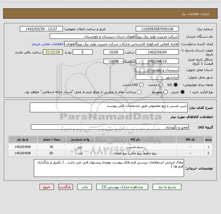 شرح کلی نیاز: شین مسی و پیچ مخصوص طبق مشخصات فنی پیوست
