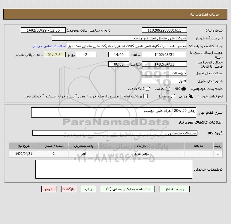 شرح کلی نیاز: روغن 20w 50 بهران طبق پیوست