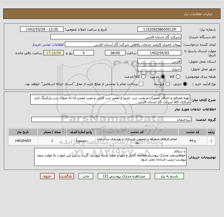 شرح کلی نیاز: تهیه مصالح و اجرای تعمیرات و نصب درب جدید و تعمیر درب قبلی و نصب مجدد آن به عنوان درب پارکینگ انبار مرکزی کالا شرکت گاز استان فارس
