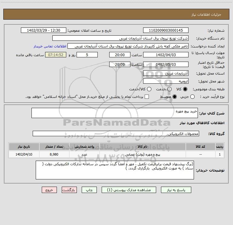 نام دستگاه خریدار:شرکت توزیع نیروی برق استان آذربایجان غربی