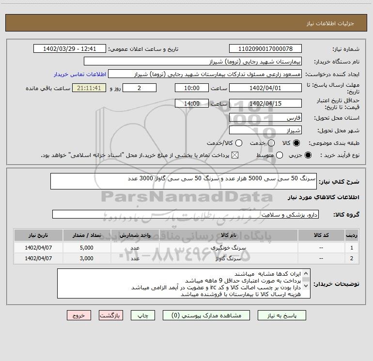شرح کلی نیاز: سرنگ 50 سی سی 5000 هزار عدد و سرنگ 50 سی سی گاواژ 3000 عدد