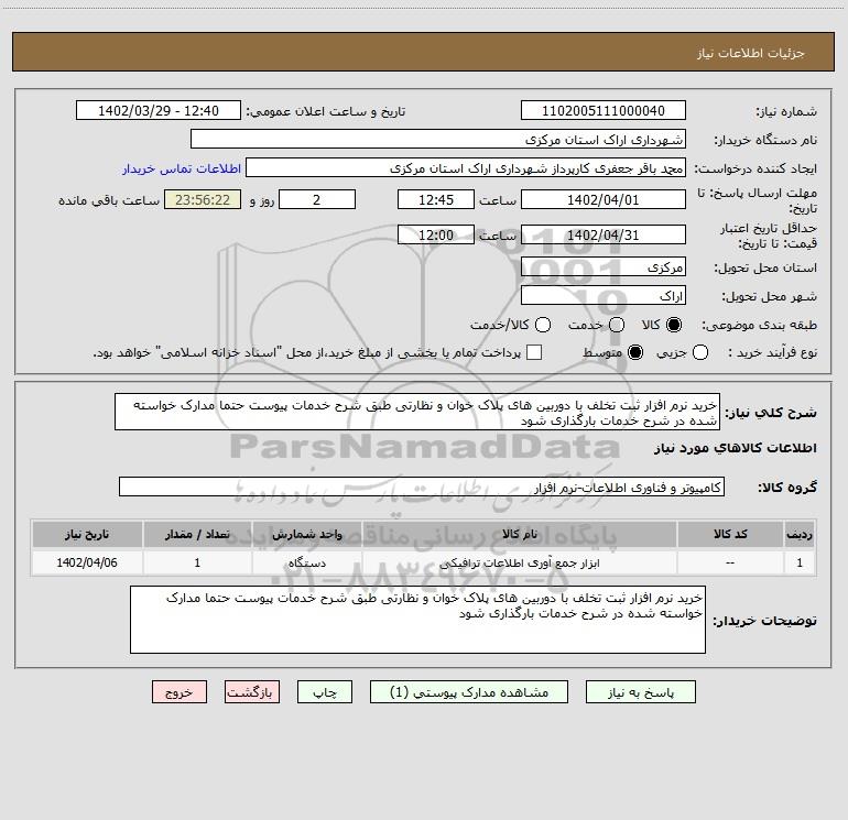 شرح کلی نیاز: خرید نرم افزار ثبت تخلف با دوربین های پلاک خوان و نظارتی طبق شرح خدمات پیوست حتما مدارک خواسته شده در شرح خدمات بارگذاری شود