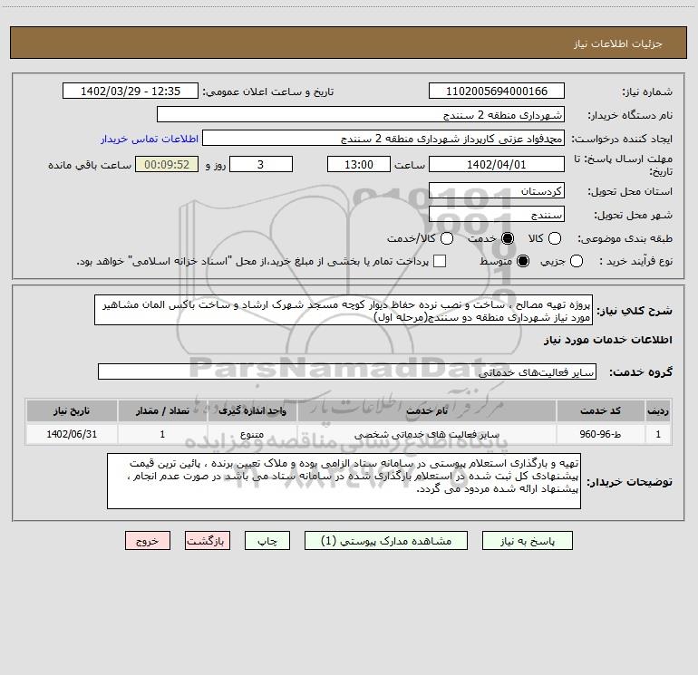 شرح کلی نیاز: پروژه تهیه مصالح ، ساخت و نصب نرده حفاظ دیوار کوچه مسجد شهرک ارشاد و ساخت باکس المان مشاهیر مورد نیاز شهرداری منطقه دو سنندج(مرحله اول)