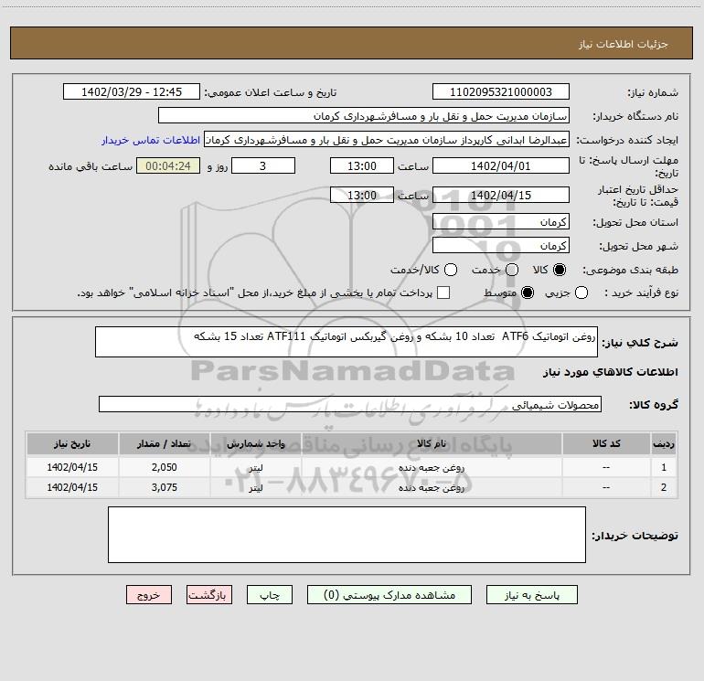 نام دستگاه خریدار:سازمان مدیریت حمل و نقل بار و مسافرشهرداری کرمان