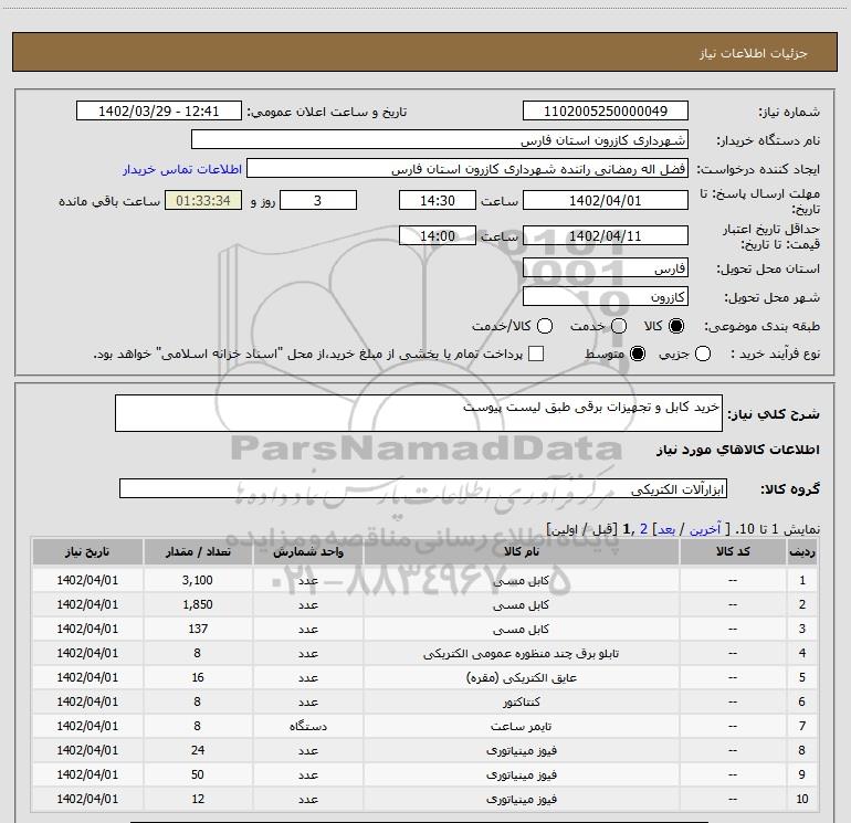 شرح کلی نیاز: خرید کابل و تجهیزات برقی طبق لیست پیوست
