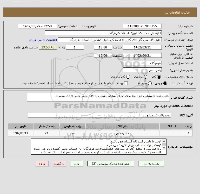 شرح کلی نیاز: تامین مواد شیمیایی مورد نیاز برای اجرای مبارزه تلفیقی با آفات نباتی طبق فرمت پیوست