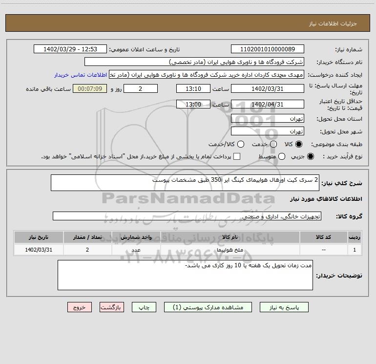 شرح کلی نیاز: 2 سری کیت اورهال هواپیمای کینگ ایر 350i طبق مشخصات پیوست