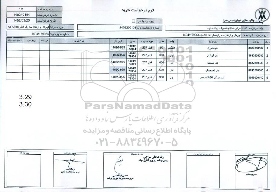 | 3 | 8682860330 | تینر شستشو | لیتر | 600 | قطار 207 | 1404/179364 | 1402.3.25 |