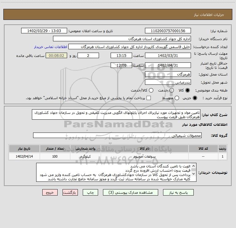 شرح کلی نیاز: تامین مواد و تجهیزات مورد نیازبرای اجرای پایلوتهای الگویی مدیریت تلفیقی و تحویل در سازمان جهاد کشاورزی هرمزگان طبق فرمت پیوست