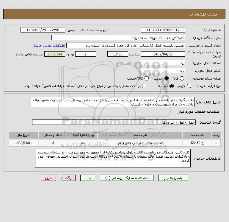 شرح کلی نیاز: به کارگیری 3نفر راننده جهت انجام کلیه امور مربوط به حمل و نقل و جابجایی پرسنل سازمان جهت ماموریتهای داخل و خارج از شهرستان و خارج از استان